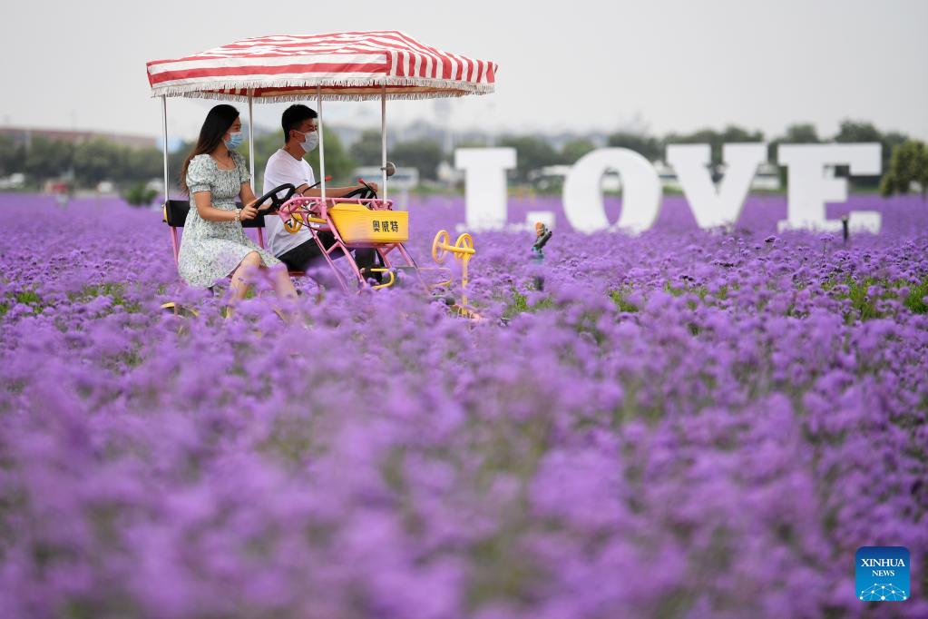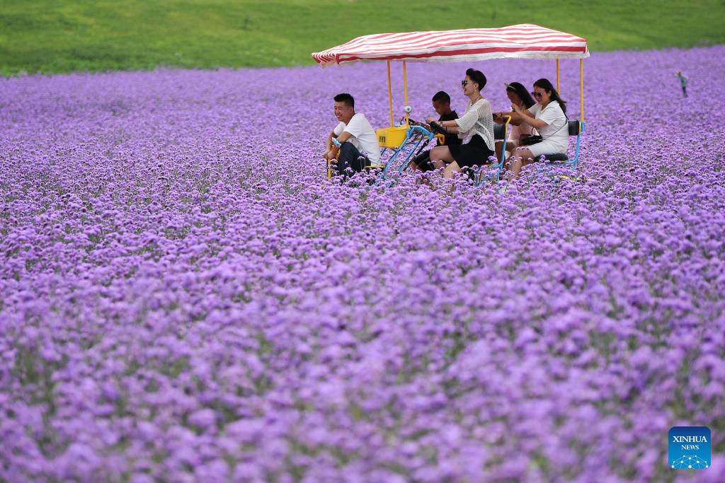 Tourists enjoy themselves in a sea of flowers in Lanzhou New Area in Lanzhou, northwest China's Gansu Province, Aug. 10, 2022.