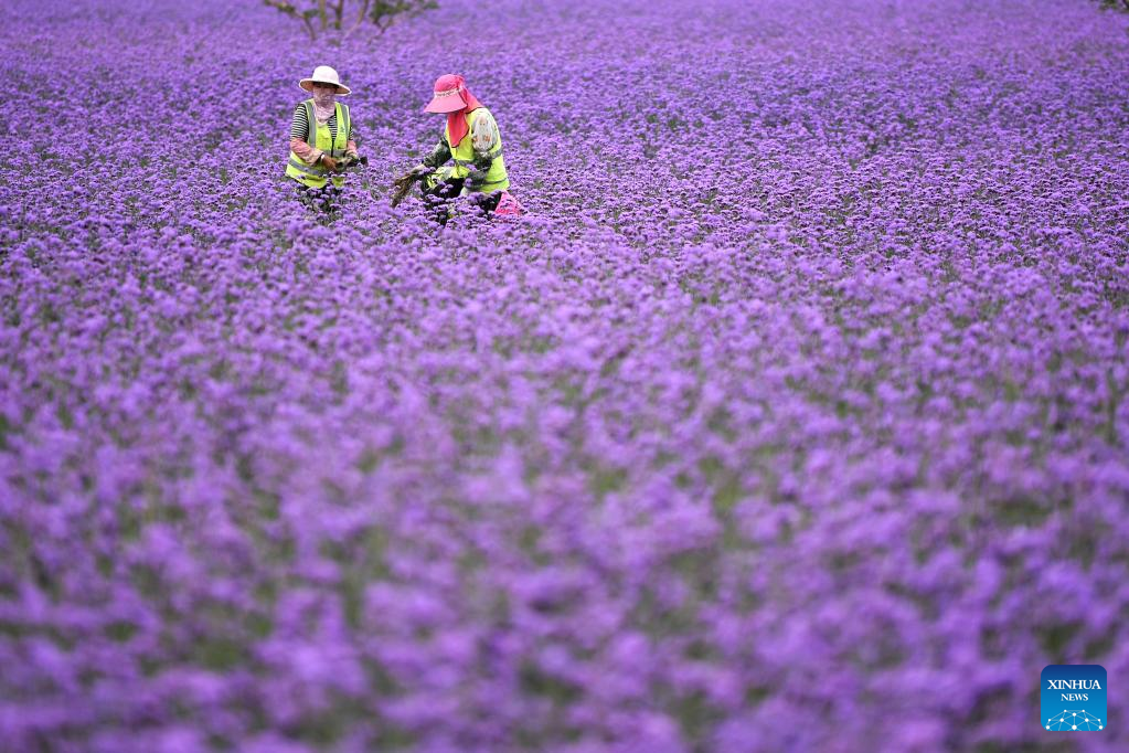 Workers weed in a sea of flowers in Lanzhou New Area in Lanzhou, northwest China's Gansu Province, Aug. 10, 2022.