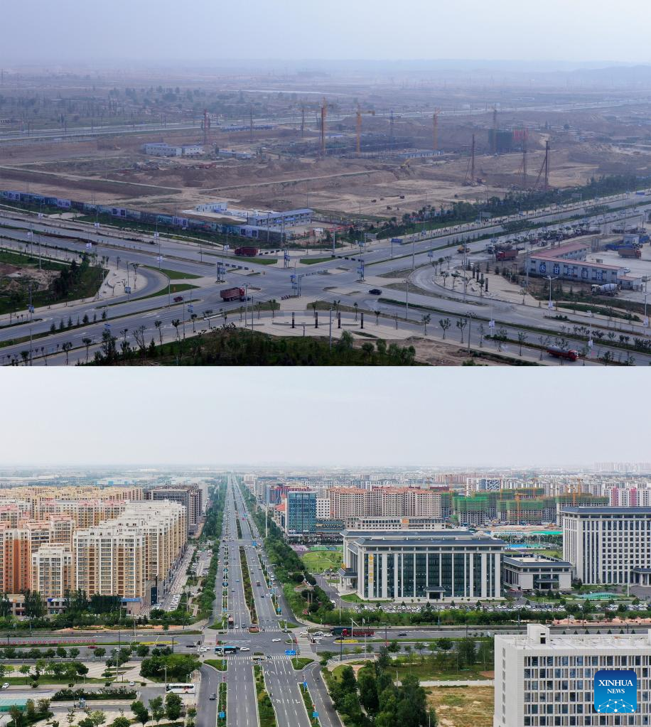 Combo photo shows a view of Huanghe avenue and the surrounding area on Aug. 22, 2013 (top, photo provided by Lanzhou New Area), and Huanghe avenue and the surrounding area on Aug. 10, 2022 (aerial photo taken by Chen Bin), in Lanzhou New Area in Lanzhou, northwest China's Gansu Province.