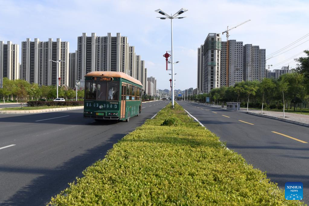 A new energy bus runs on a road in Lanzhou New Area in Lanzhou, northwest China's Gansu Province, Aug. 9, 2022.