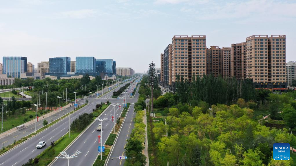 Aerial photo taken on Aug. 10, 2022 shows the cityscape of Lanzhou New Area in Lanzhou, northwest China's Gansu Province.