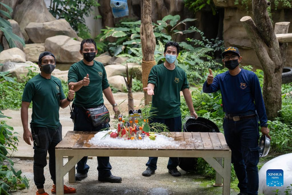 Zookeepers prepare birthday treats for giant panda Xing Xing at Zoo Negara near Kuala Lumpur, Malaysia, Aug. 23, 2022. Giant pandas Xing Xing and Liang Liang celebrated their 16th birthday at Zoo Negara near Malaysia's capital Kuala Lumpur on Tuesday. Xing Xing and Liang Liang, arrived in Malaysia in 2014, have given birth to three giant panda cubs. (Xinhua/Zhu Wei)