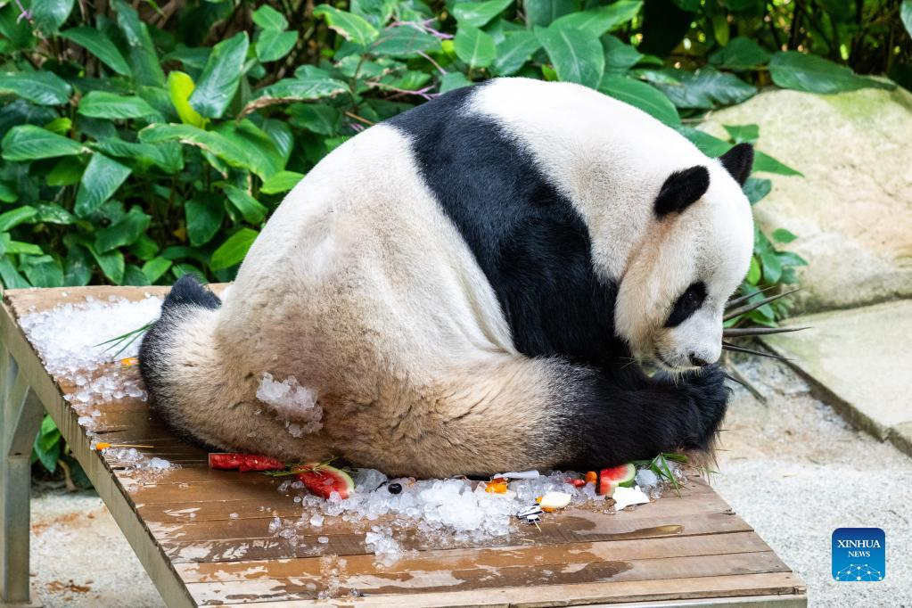 Giant panda Xing Xing enjoys his birthday treats at Zoo Negara near Kuala Lumpur, Malaysia, Aug. 23, 2022. Giant pandas Xing Xing and Liang Liang celebrated their 16th birthday at Zoo Negara near Malaysia's capital Kuala Lumpur on Tuesday. Xing Xing and Liang Liang, arrived in Malaysia in 2014, have given birth to three giant panda cubs. (Xinhua/Zhu Wei)