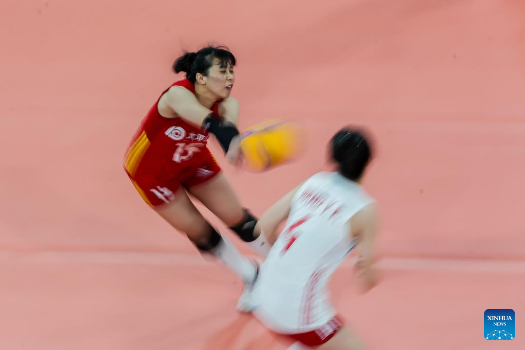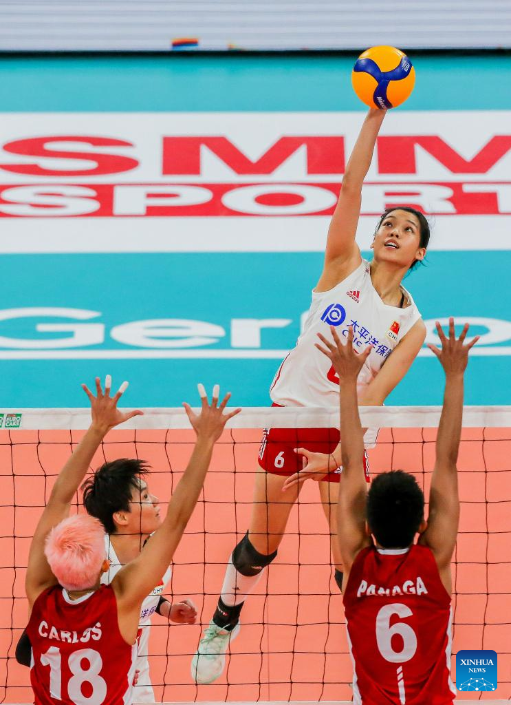 Zhuang Yushan (Top) of China spikes the ball during the preliminary round match between China and the Philippines at the 2022 AVC Cup for women at the Philsports Arena in Pasig City, the Philippines, Aug. 23, 2022. (Xinhua/Rouelle Umali)
