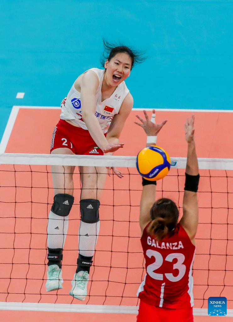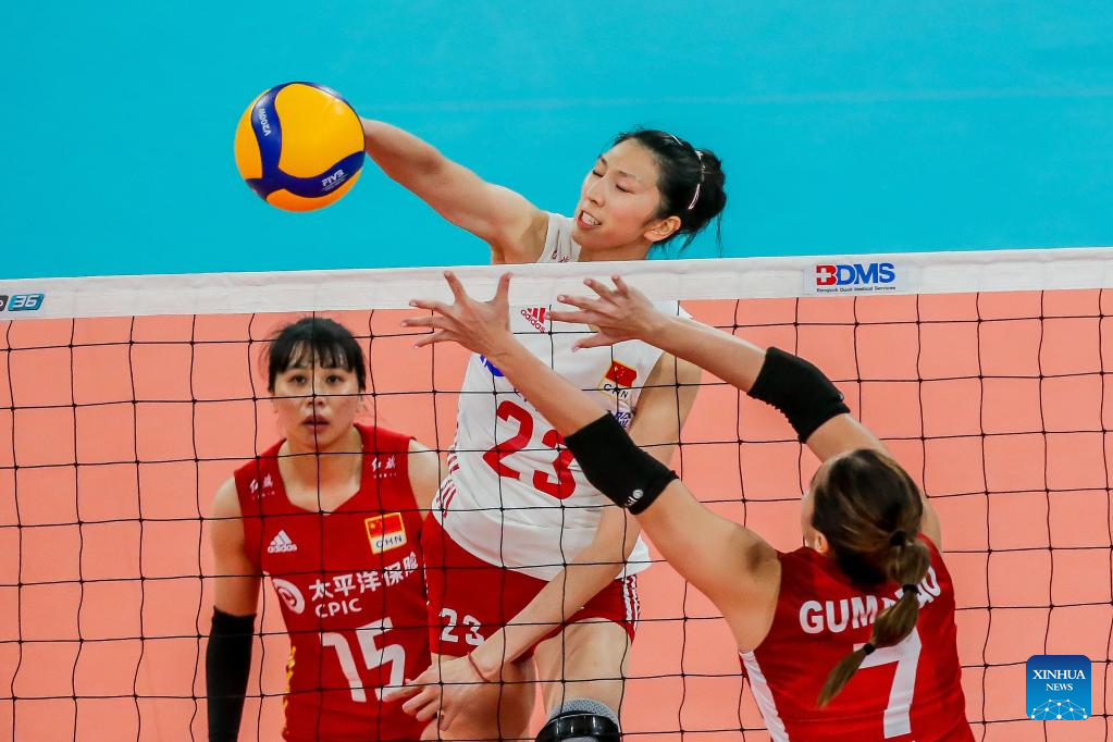 Wu Mengjie (1st R) of China spikes the ball during the preliminary round match between China and the Philippines at the 2022 AVC Cup for women at the Philsports Arena in Pasig City, the Philippines, Aug. 23, 2022. (Xinhua/Rouelle Umali)