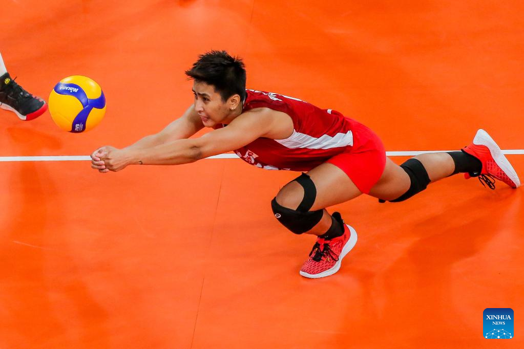 Panaga Jeanette of the Philippines saves the ball during the preliminary round match between China and the Philippines at the 2022 AVC Cup for women at the Philsports Arena in Pasig City, the Philippines, Aug. 23, 2022. (Xinhua/Rouelle Umali)
