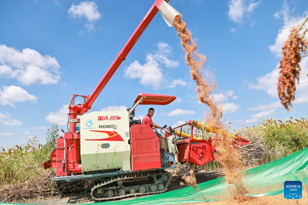 A villager drives a harvester to harvest sorghum in Minzhu Village, Zunyi city, southwest China's Guizhou Province, Aug. 22, 2022. Tuesday marks the Chushu of the solar terms. The scorching summer is going to pass by after this day. (Photo by Luo Xinghan/Xinhua)