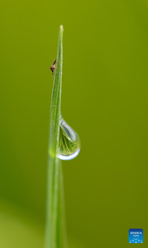 Photo taken on Aug. 17, 2022 shows the ripening grains reflected on a drop of dew on a rice leaf in Zhanliang Village of Danzhai County, Qiandongnan Miao and Dong Autonomous Prefecture, southwest China's Guizhou Province. Tuesday marks the Chushu of the solar terms. The scorching summer is going to pass by after this day. (Photo by Huang Xiaohai/Xinhua)