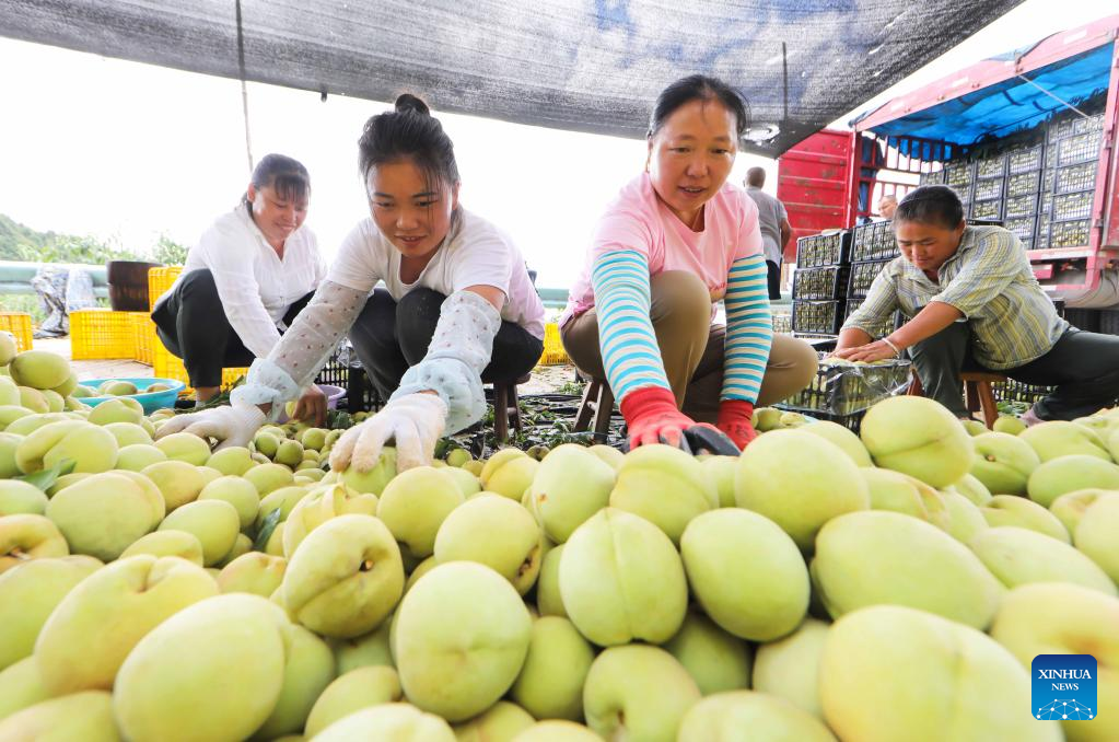 Villagers sort peaches in Xiazhai Village of Cengong County, Qiandongnan Miao and Dong Autonomous Prefecture, southwest China's Guizhou Province, Aug. 22, 2022. Tuesday marks the Chushu of the solar terms. The scorching summer is going to pass by after this day. (Photo by Luo Hui/Xinhua)