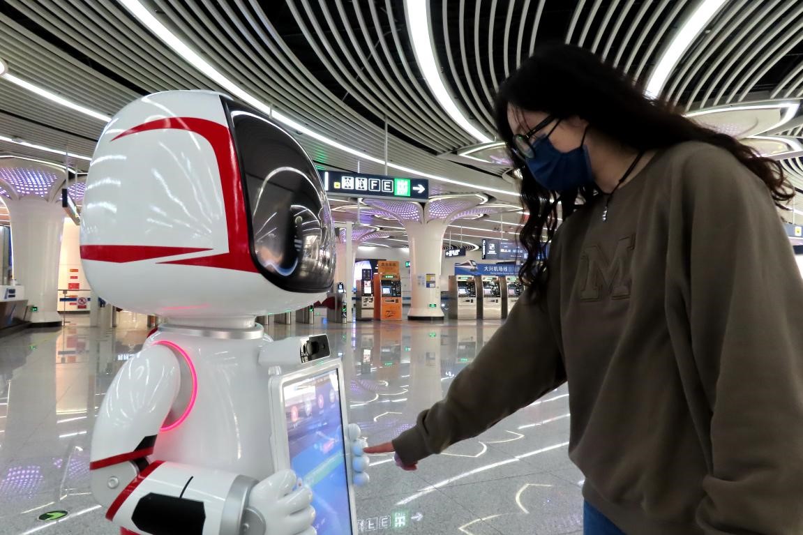 A passenger checks information from a smart service robot at the Caoqiao station of the Daxing Airport Express of the Beijing Subway, April, 10, 2022. (People's Daily Online/He Luqi)