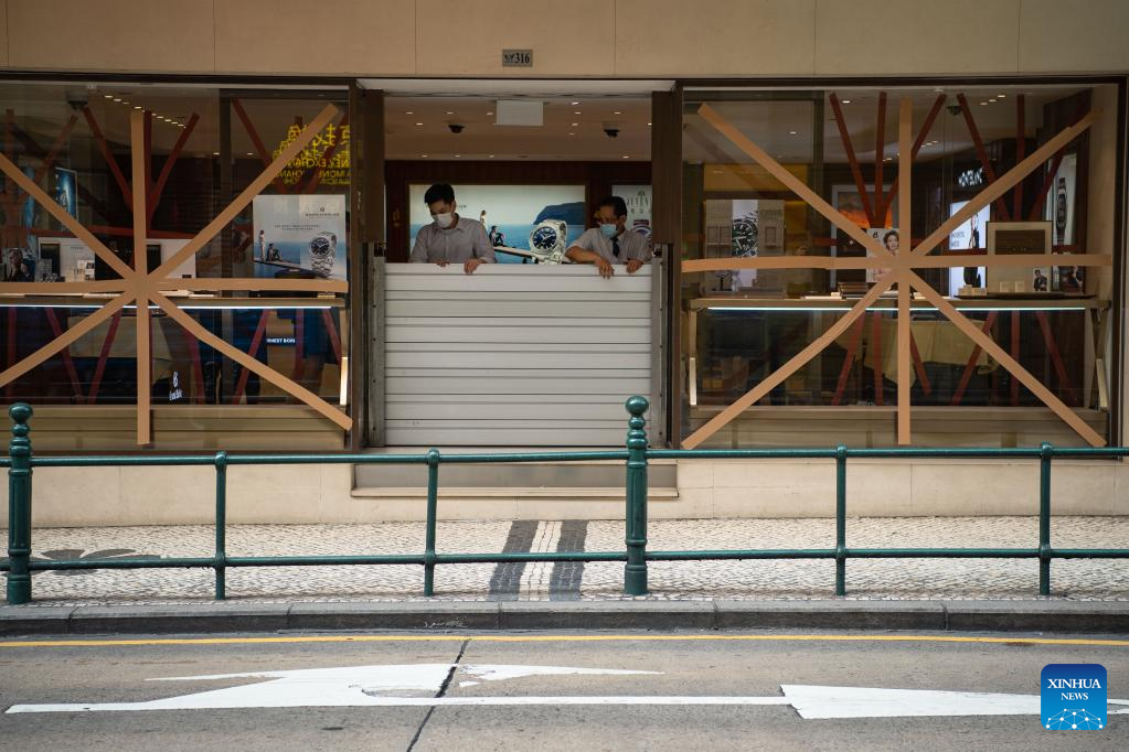 Staff members install a waterproof gate at a store in Macao, south China, Aug. 24, 2022. China on Wednesday activated a Level-IV emergency response to possible geological disasters triggered by Typhoon Ma-on, according to the Ministry of Natural Resources.