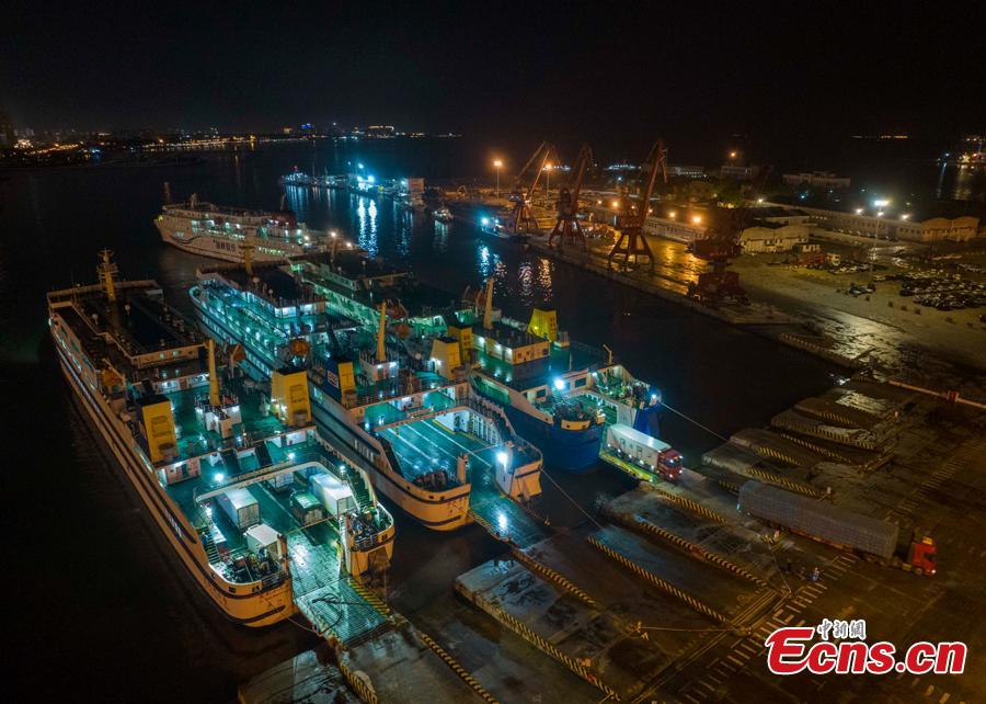 Drone photo shows ro-ro passenger ships anchor at a port in Haikou, capital of Hainan Province, Aug. 25, 2022, as Typhoon Ma-on is forecast to make landfall. (Photo: China News Service/Luo Yunfei)