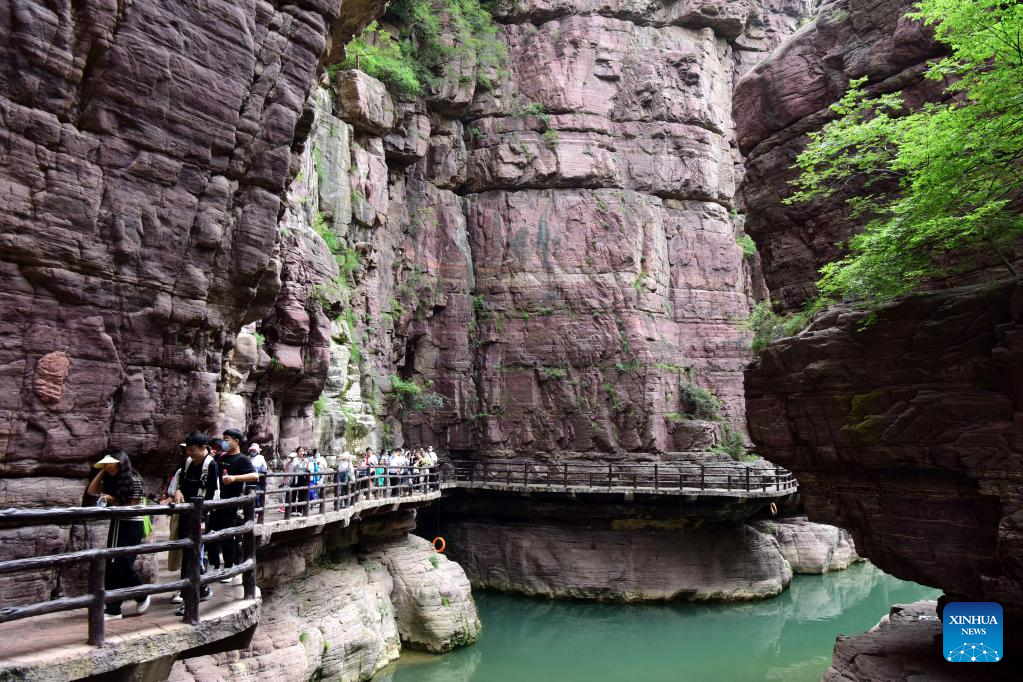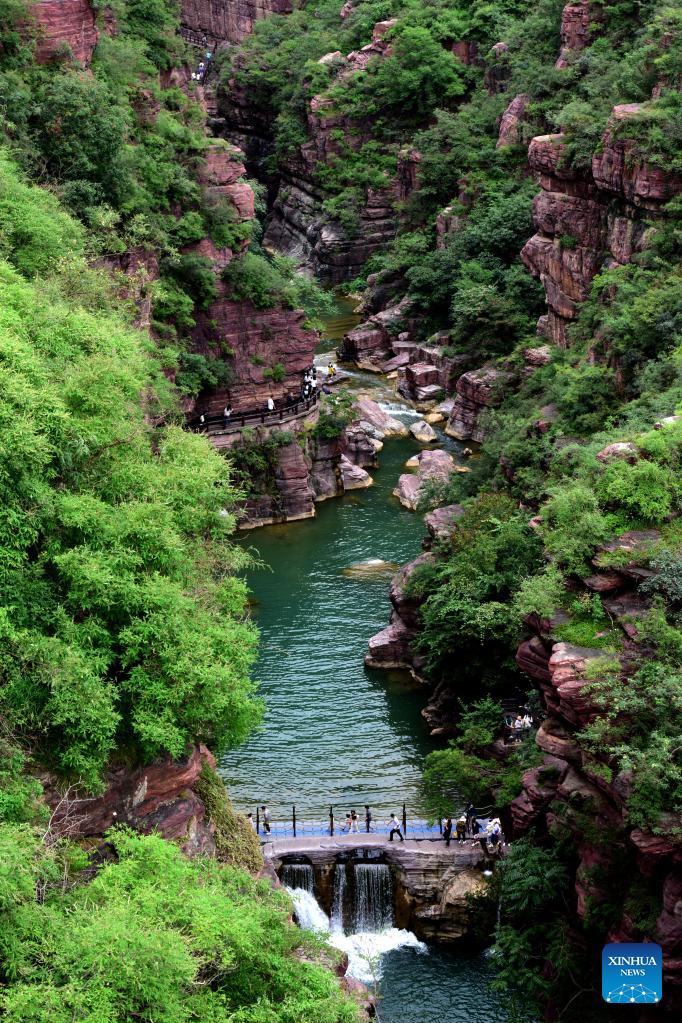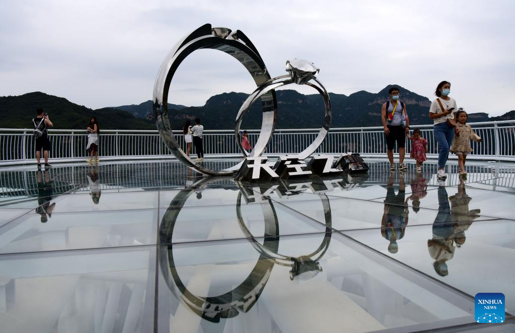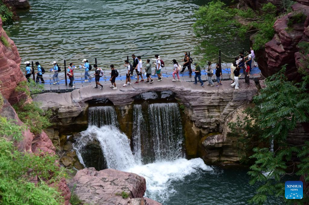 People visit the Yuntai Mountain scenic spot in central China's Henan Province, Aug. 24, 2022. (Xinhua/Lyu Guoqing)