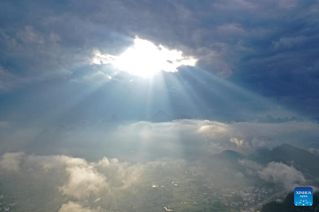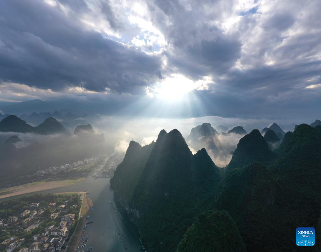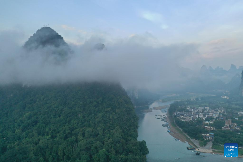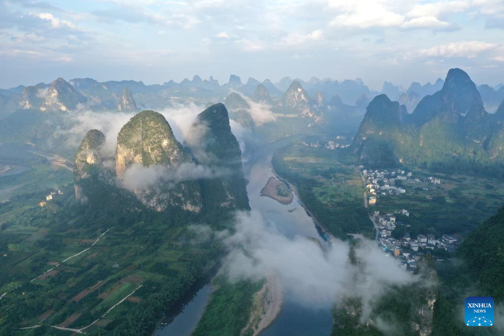 Aerial photo taken on Aug. 25, 2022 shows the scenery at Xingping Town in Yangshuo County of Guilin, south China's Guangxi Zhuang Autonomous Region. (Xinhua/Zhou Hua)