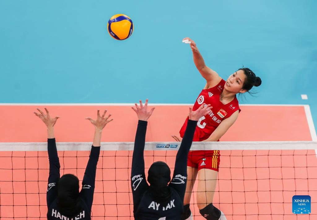 Wang Yifan (C) of China spikes during the preliminary round pool A match against Iran in the 2022 AVC Cup for Women at the Philsports Arena in Pasig City, the Philippines, Aug. 25, 2022. (Xinhua/Rouelle Umali)
