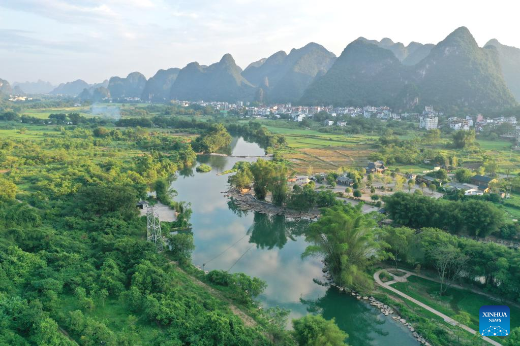 Aerial photo taken on Aug. 24, 2022 shows the scenery along Yulong River in Yangshuo County, Guilin City, south China's Guangxi Zhuang Autonomous Region. (Xinhua/Zhou Hua)