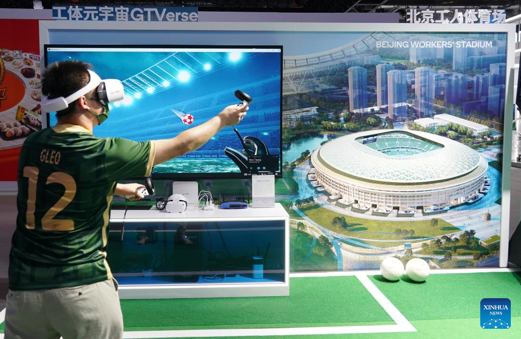 A staff member displays GTVerse during a media preview of the 2022 China International Fair for Trade in Services (CIFTIS) at the China National Convention Center in Beijing, capital of China, Aug. 28, 2022. The 2022 CIFTIS will be held in Shougang Park and the China National Convention Center in Beijing from Aug. 31 to Sept. 5. (Xinhua/Zhang Chenlin)