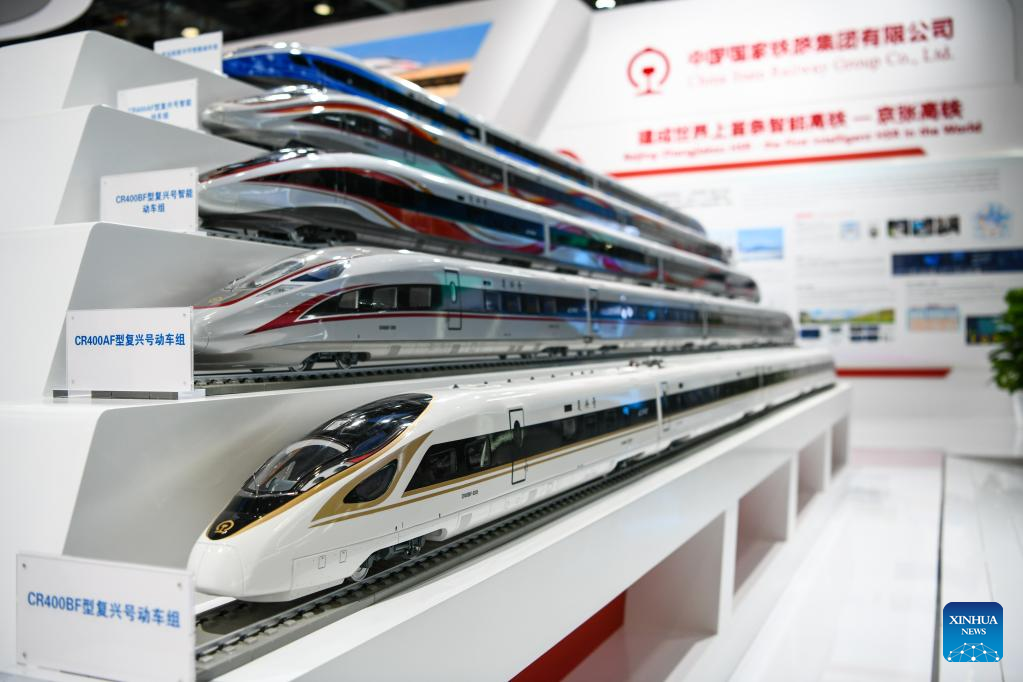 Photo taken on Aug. 28, 2022 shows a railway-themed booth of the 2022 China International Fair for Trade in Services (CIFTIS) at the China National Convention Center in Beijing, capital of China. The 2022 CIFTIS will be held at the China National Convention Center and the Shougang Park in Beijing from Aug. 31 to Sept. 5. (Xinhua/Han Xu)