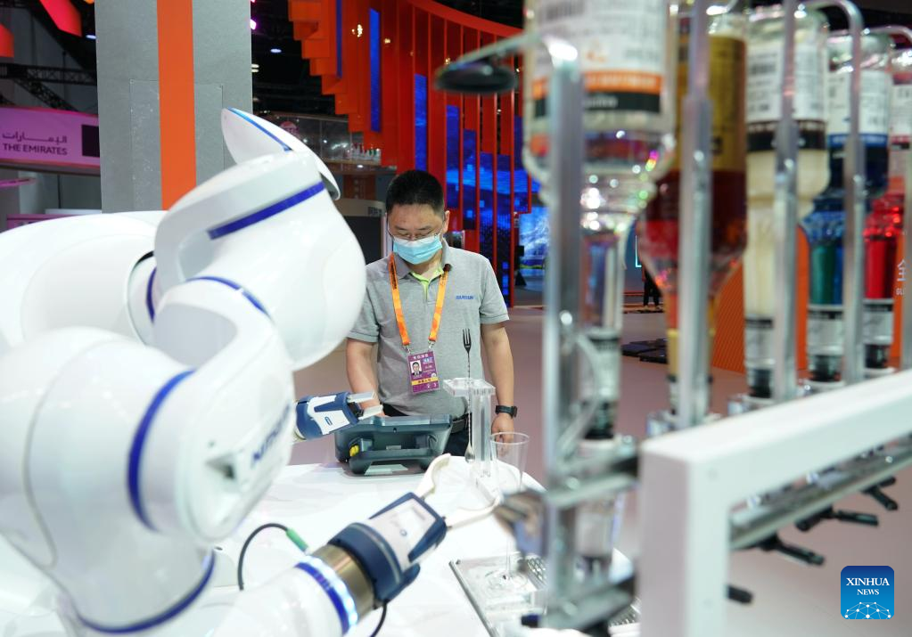 An exhibitor debugs a robot during a media preview of the 2022 China International Fair for Trade in Services (CIFTIS) at the China National Convention Center in Beijing, capital of China, Aug. 28, 2022. The 2022 CIFTIS will be held in Shougang Park and the China National Convention Center in Beijing from Aug. 31 to Sept. 5. (Xinhua/Zhang Chenlin)