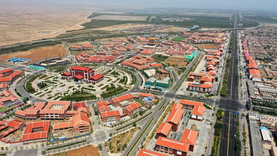 Aerial photo taken on July 15, 2021 shows the panoramic view of the Minning Town in northwest China's Ningxia Hui Autonomous Region. (Xinhua/Wang Peng)