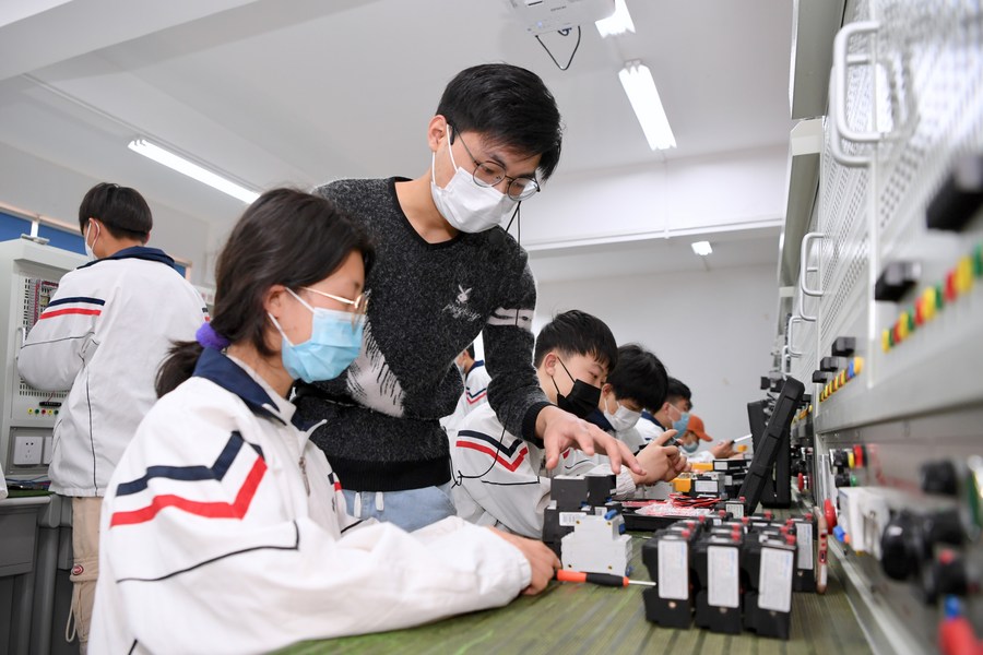 A teacher guides students from northwest China's Ningxia Hui Autonomous Region at SCUD Senior Technical School in Fuzhou, east China's Fujian Province, March 4, 2021. (Xinhua/Jiang Kehong)