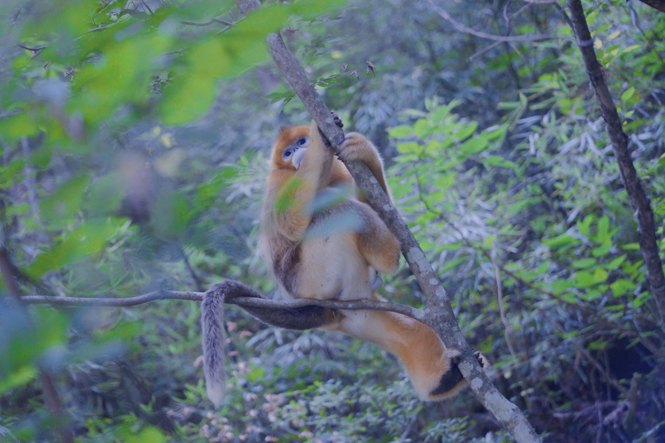 The golden snub-nosed monkey, a national first-class protected species, is spotted climbing a tree in the forested canopy of the Qinling Mountains, northwest China’s Shaanxi Province on August 10, 2022. (People’s Daily Online/Yuan Meng)