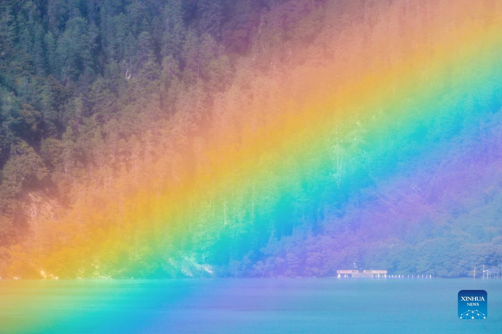 A rainbow appears in the sky over the Basum Lake in the city of Nyingchi, southwest China's Tibet Autonomous Region, Aug. 29, 2022. (Xinhua/Jiang Fan)