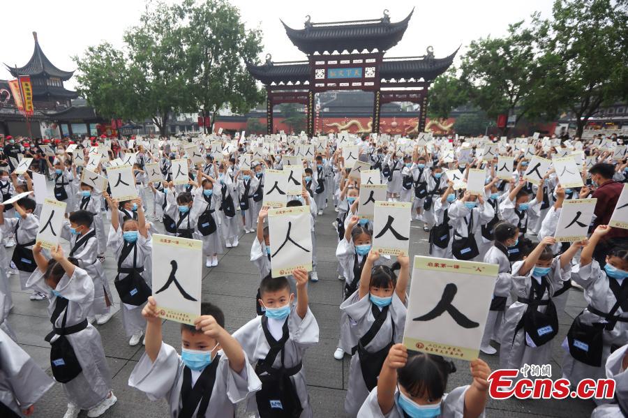 First-grade pupils display their Chinese calligraphy of "Ren" (human) during the first writing ceremony of a new semester at Fuzimiao, or the Confucius Temple in Nanjing, east Chinas Jiangsu Province, Aug. 31, 2022. Students across China embraced their new semester on Thursday. (Photo: China News Service/Yang Bo)