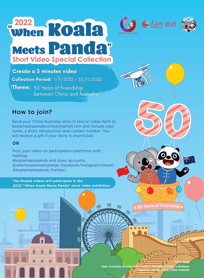 SYDNEY, August 31 (People’s Daily Online) – “When Koala Meets Panda” is back. Co-organized by the Consulate-General of the People’s Republic of China in Brisbane and People’s Daily Online Australia, the 2022 “When Koala Meets Panda” China-Australia Short Video Contest Special Collection will kick off on Sept. 1, 2022.