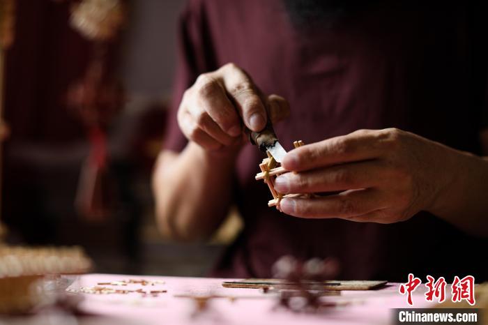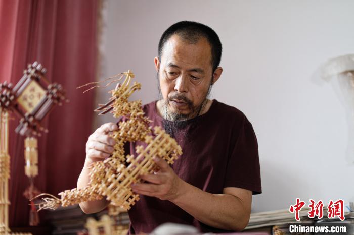 Zhao Runsheng makes a sorghum straw handiwork. (Photo/Qie Xiaowei)