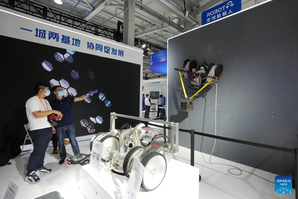 Visitors look at a cleaning robot at the 2022 China International Fair for Trade in Services (CIFTIS) in Beijing, capital of China, Sept. 1, 2022. The CIFTIS is held in Beijing from Aug. 31 to Sept. 5. (Xinhua/Ju Huanzong)