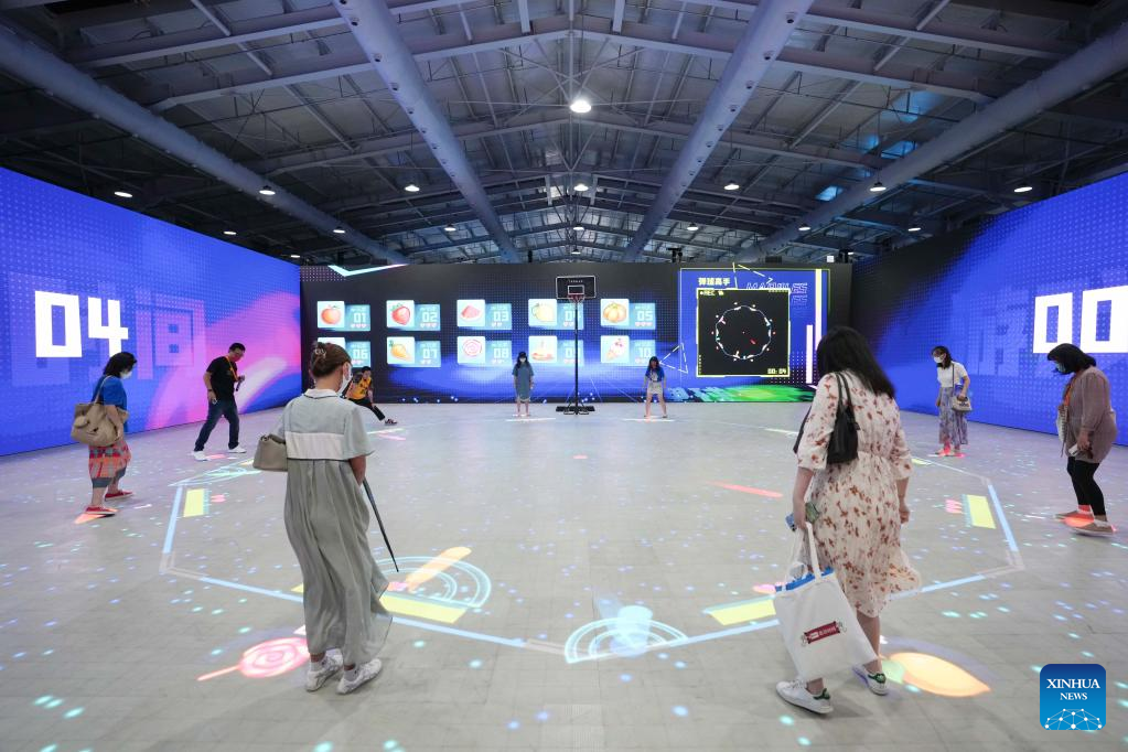 Visitors play an interactive game at the 2022 China International Fair for Trade in Services (CIFTIS) in Beijing, capital of China, Sept. 1, 2022. The CIFTIS is held in Beijing from Aug. 31 to Sept. 5. (Xinhua/Ju Huanzong)