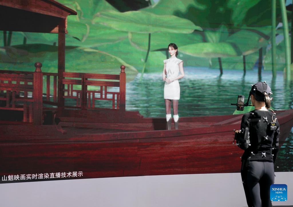 A staff member demonstrates a real-time rendering technology for livestreaming purpose at the 2022 China International Fair for Trade in Services (CIFTIS) in Beijing, capital of China, Sept. 1, 2022. The CIFTIS is held in Beijing from Aug. 31 to Sept. 5. (Xinhua/Zhang Chenlin)