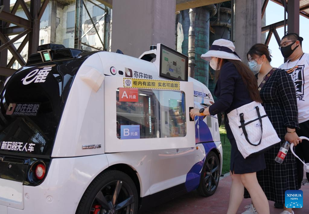 Visitors triy the self-service shopping with an autonomous vending vehicle displayed at the 2022 China International Fair for Trade in Services (CIFTIS) in Beijing, capital of China, Sept. 1, 2022. The CIFTIS is held in Beijing from Aug. 31 to Sept. 5. (Xinhua/Zhang Chenlin)