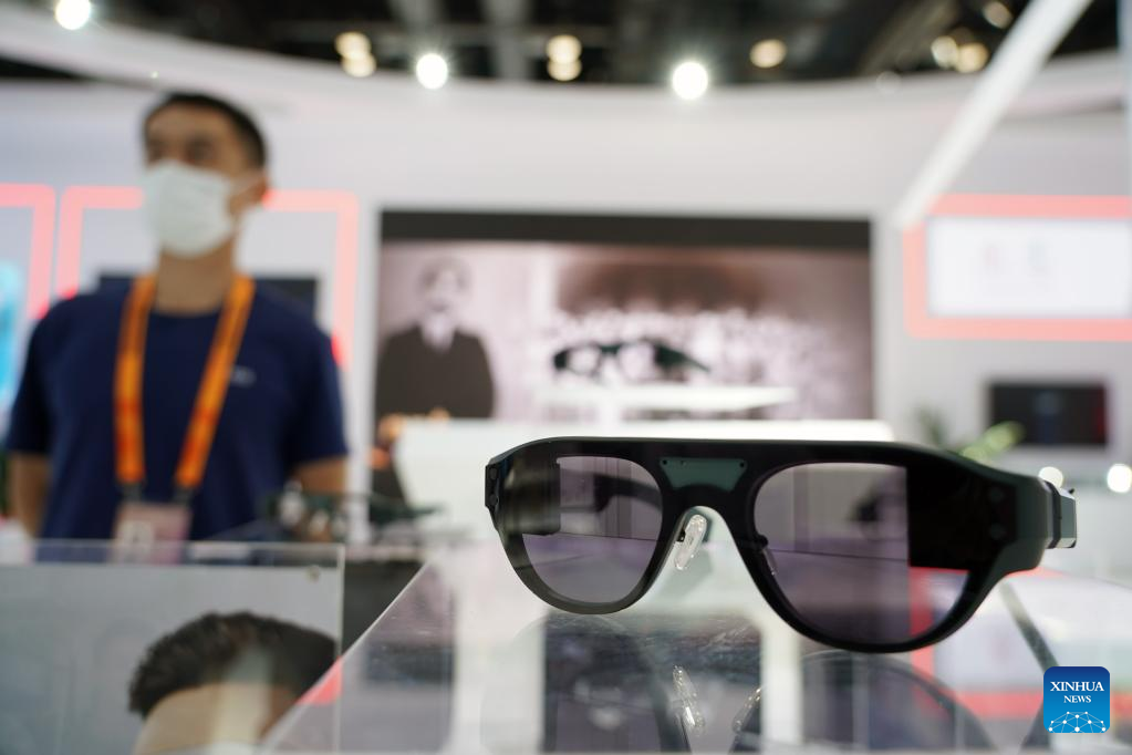 Photo taken on Sept. 1, 2022 shows an AR caption glass displayed at the 2022 China International Fair for Trade in Services (CIFTIS) in Beijing, capital of China. The CIFTIS is held in Beijing from Aug. 31 to Sept. 5. (Xinhua/Ren Chao)