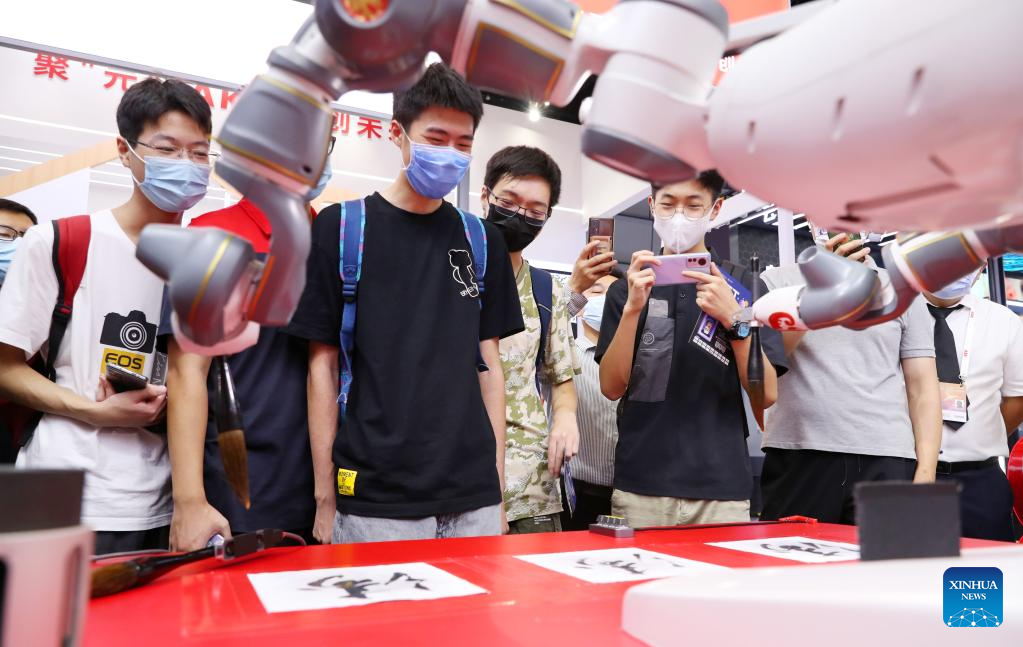 Visitors watch an AI robot performing calligraphy at the 2022 World Artificial Intelligence Conference (WAIC) in east China's Shanghai, Sept. 1, 2022. With the theme of "Intelligent Connectivity, Infinite Multiverse", this year's WAIC kicked off in China's Shanghai on Thursday. (Xinhua/Fang Zhe)