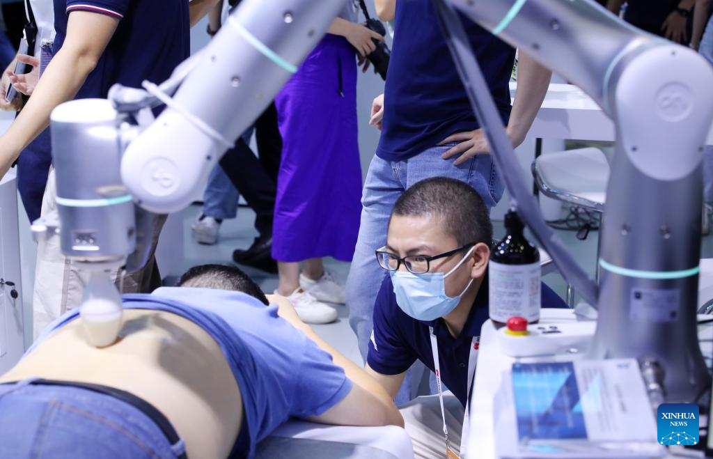 A visitor experiences a massage robot at the 2022 World Artificial Intelligence Conference (WAIC) in east China's Shanghai, Sept. 1, 2022. With the theme of "Intelligent Connectivity, Infinite Multiverse", this year's WAIC kicked off in China's Shanghai on Thursday. (Xinhua/Fang Zhe)