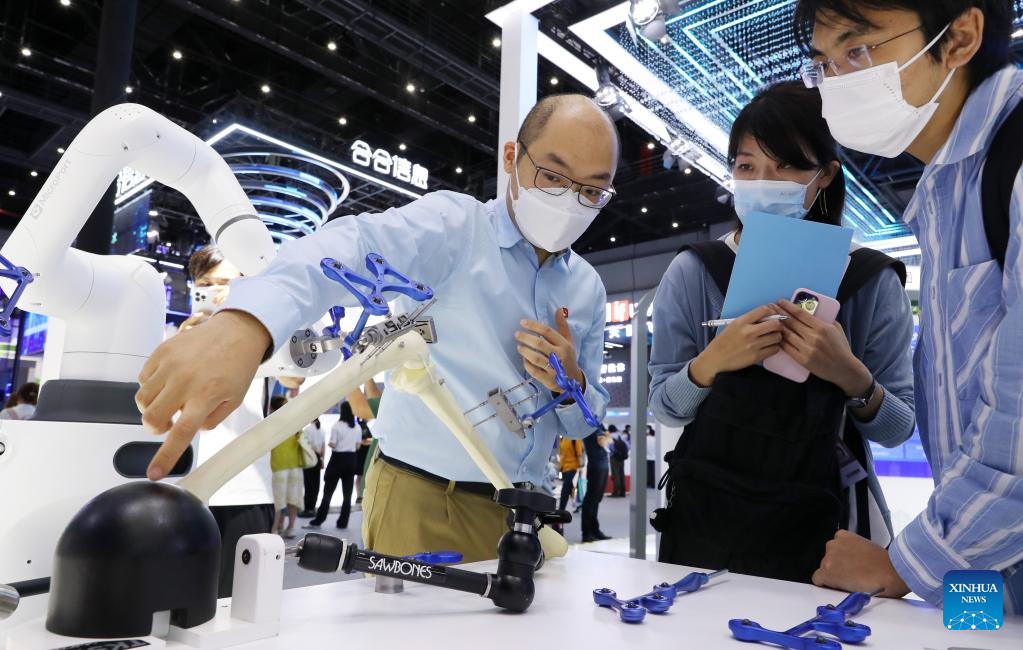 A staff member introduces a minimally invasive orthopedic surgery robot to visitors at the 2022 World Artificial Intelligence Conference (WAIC) in east China's Shanghai, Sept. 1, 2022. With the theme of "Intelligent Connectivity, Infinite Multiverse", this year's WAIC kicked off in China's Shanghai on Thursday. (Xinhua/Fang Zhe)