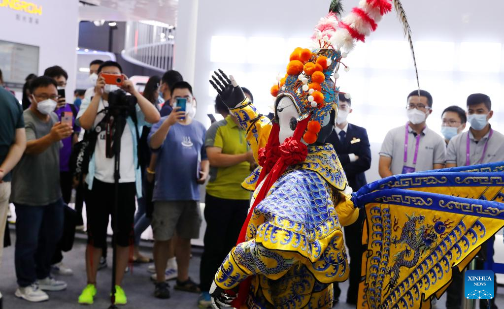 An AI robot performs Peking opera at the 2022 World Artificial Intelligence Conference (WAIC) in east China's Shanghai, Sept. 1, 2022. With the theme of "Intelligent Connectivity, Infinite Multiverse", this year's WAIC kicked off in China's Shanghai on Thursday. (Xinhua/Fang Zhe)