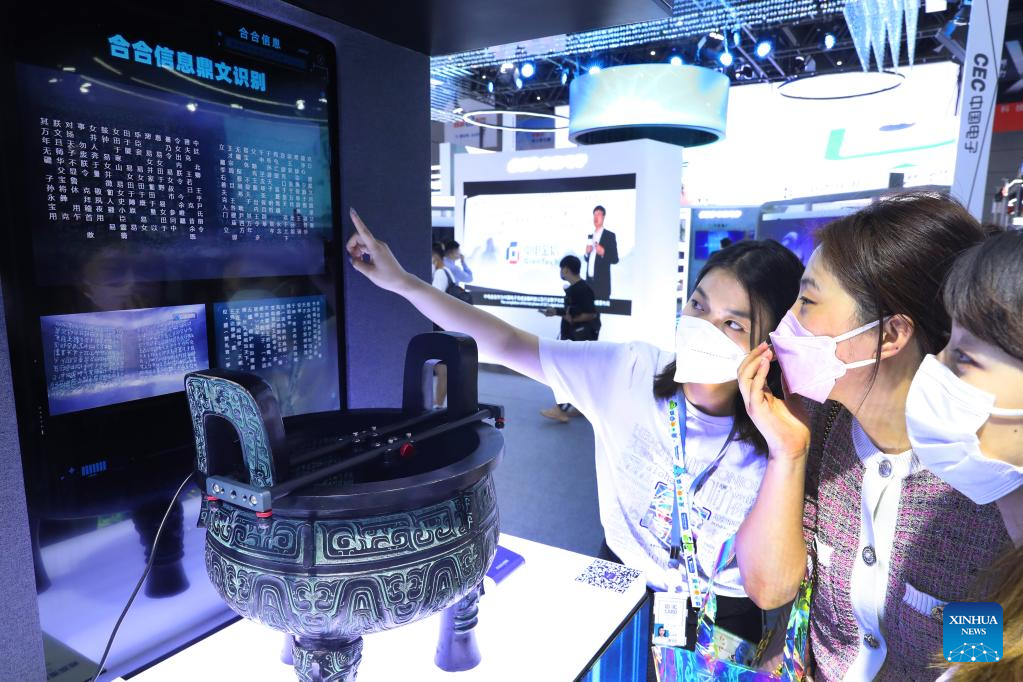 A staff member (1st L) introduces an AI character recognition system to visitors at the 2022 World Artificial Intelligence Conference (WAIC) in east China's Shanghai, Sept. 1, 2022. With the theme of "Intelligent Connectivity, Infinite Multiverse", this year's WAIC kicked off in China's Shanghai on Thursday. (Xinhua/Fang Zhe)
