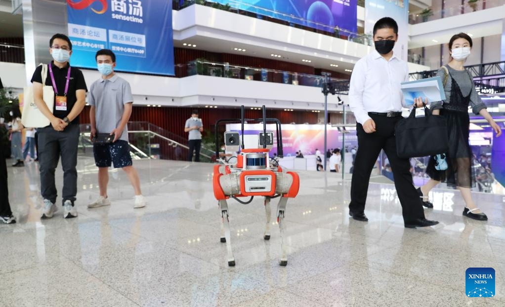 An inspection robot for fire reconnaissance is seen at the 2022 World Artificial Intelligence Conference (WAIC) in east China's Shanghai, Sept. 1, 2022. With the theme of "Intelligent Connectivity, Infinite Multiverse", this year's WAIC kicked off in China's Shanghai on Thursday. (Xinhua/Fang Zhe)