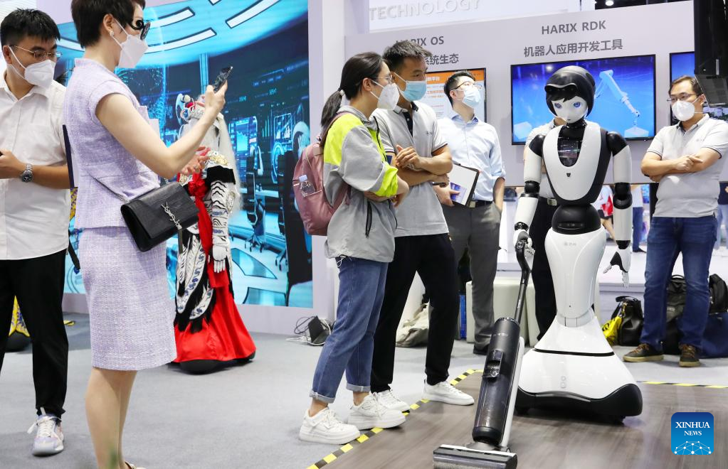 Visitors view an AI robot at the 2022 World Artificial Intelligence Conference (WAIC) in east China's Shanghai, Sept. 1, 2022. With the theme of "Intelligent Connectivity, Infinite Multiverse", this year's WAIC kicked off in China's Shanghai on Thursday. (Xinhua/Fang Zhe)