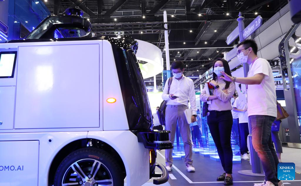 A staff member (R) introduces an intelligent logistics vehicle at the 2022 World Artificial Intelligence Conference (WAIC) in east China's Shanghai, Sept. 1, 2022. With the theme of "Intelligent Connectivity, Infinite Multiverse", this year's WAIC kicked off in China's Shanghai on Thursday. (Xinhua/Fang Zhe)