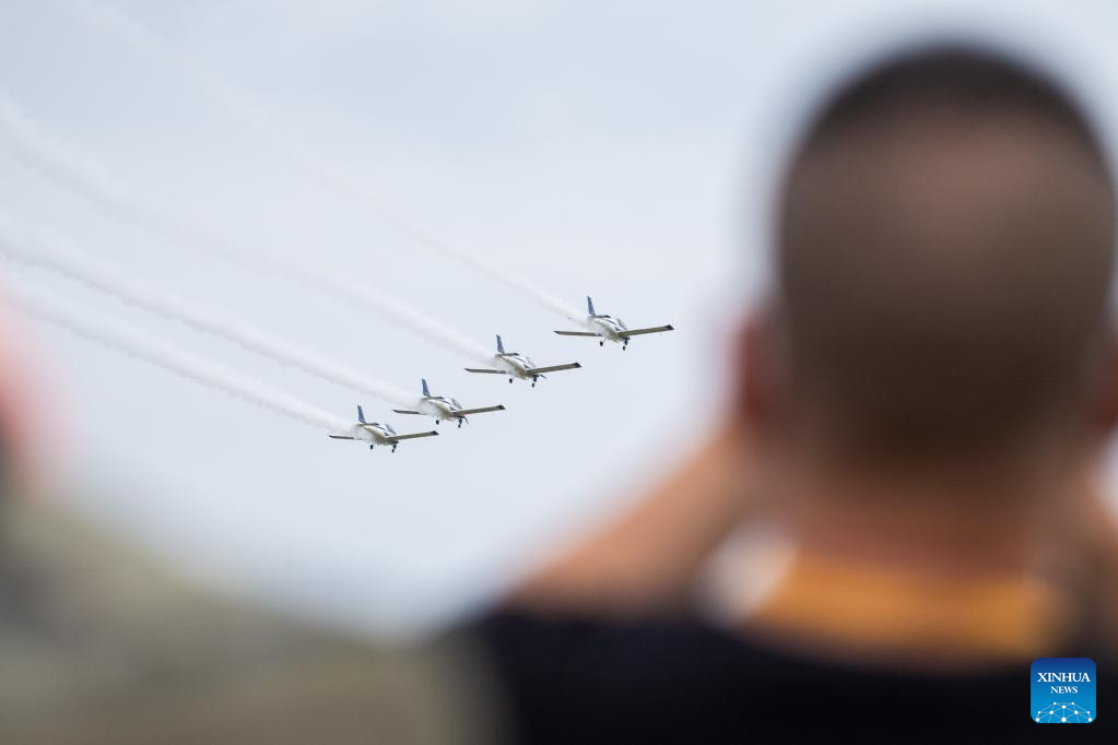 Performance is staged during an air show, which is a part of the 2022 Hunan (International) General Aviation Industry Expo, at the Lusong Airport of Zhuzhou City, central China's Hunan Province, Sept. 1, 2022. The 2022 Hunan (International) General Aviation Industry Expo opened here on Thursday. The expo comprises a static exhibition at the Changsha International Convention and Exhibition Center in Changsha and an air show at the Lusong Airport of Zhuzhou City, both in central China's Hunan Province. (Xinhua/Chen Sihan)