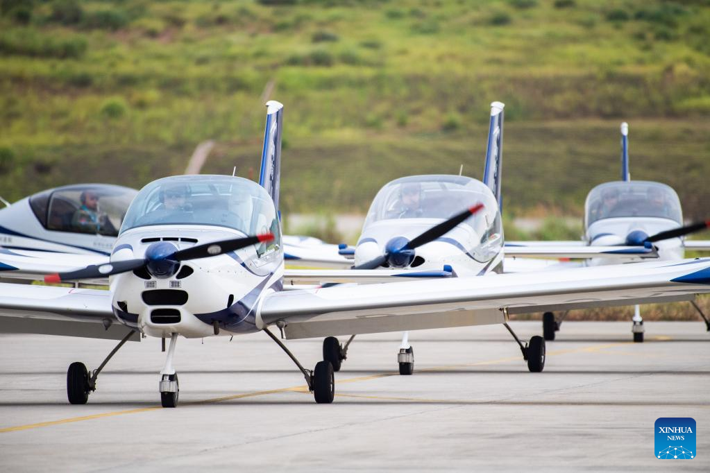 Fixed-wing aircraft return to the runway after their performance during an air show, which is a part of the 2022 Hunan (International) General Aviation Industry Expo, at the Lusong Airport of Zhuzhou City, central China's Hunan Province, Sept. 1, 2022. The 2022 Hunan (International) General Aviation Industry Expo opened here on Thursday. The expo comprises a static exhibition at the Changsha International Convention and Exhibition Center in Changsha and an air show at the Lusong Airport of Zhuzhou City, both in central China's Hunan Province. (Xinhua/Chen Sihan)