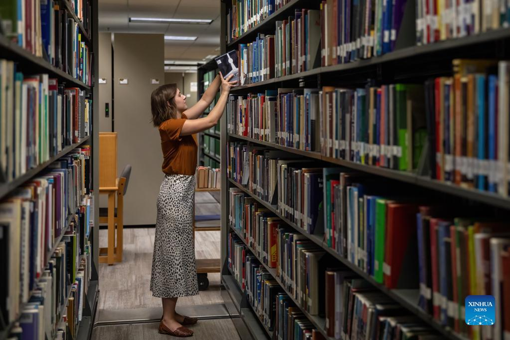 A work-study student restocks a bookshelf with books that students have returned at Baylor University in Waco, Texas, the United States, on Aug. 28, 2022. (Photo by Xin Jin/Xinhua)