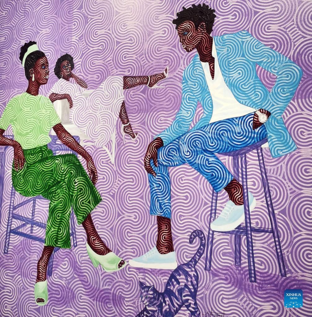 Photo taken on Sept. 1, 2022 shows a painting of a contemporary African art exhibition in Vilnius, capital of Lithuania. More than 30 contemporary African artworks by fifteen artists from six countries are on display. (Photo by Yang Weihua/Xinhua)