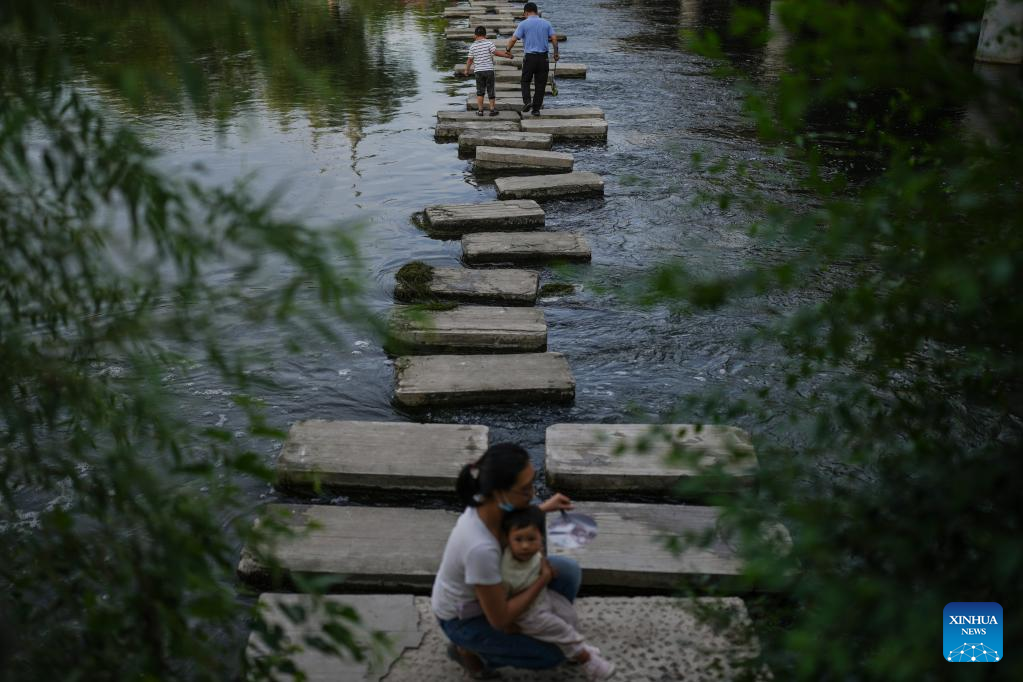 People walk along a stone path on the Liangshui River in Beijing, capital of China, Aug. 24, 2022. (Xinhua/Peng Ziyang)