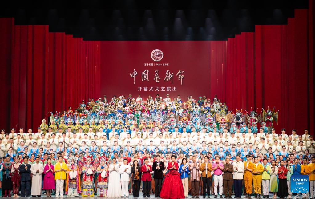 Artists pose on the stage during the opening ceremony of the 13th China Art Festival held at the National Center for the Performing Arts in Beijing, capital of China, Sept. 1, 2022. (Xinhua/Chen Zhonghao)