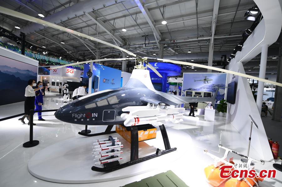 An unmanned helicopter for firefighting is displayed at the 2022 China International Fair for Trade in Services (CIFTIS) at the Shougang Park in Beijing. (Photo: China News Service/Tian Yuhao)